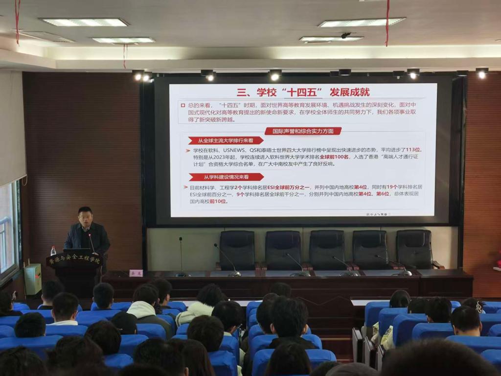 岳龙全面介绍了党的二十届四中全会召开的背景和内容,重点围绕《中共中央关于制定国民经济和社会发展第十五个五年规划的建议》,从“十五五”时期经济社会发展的指导方针、遵循原则、主要目标和任务等方面进行了系统解读。他强调要充分认识到“十五五”时期在基本实现社会主义现代化进程中具有承前启后的重要地位,号召大家要深刻领悟“两个确立”的决定性意义,增强“四个意识”、坚定“四个自信”、做到“两个维护”,以服务国家资源安全为使命,认真学好专业知识,不断增强专业自信,在社会主义现代化强国建设中做出应有贡献。