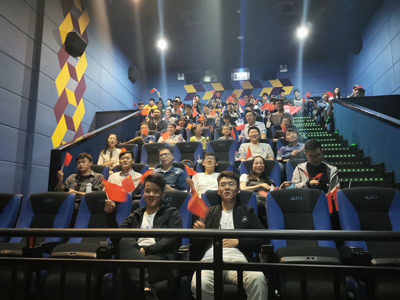 正式观影前,党员同志们心情激动,大家挥舞着手中的五星红旗,齐声合唱《我和我的祖国》,共同表达对祖国母亲的祝福与爱国之情。
