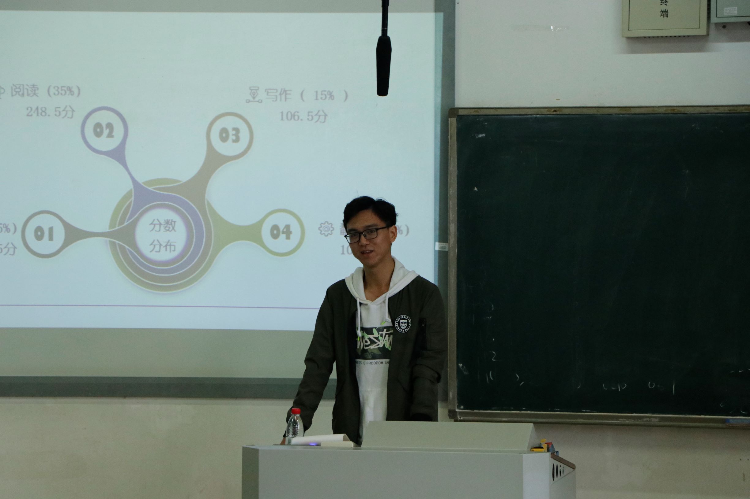 分享会中,主讲人杨沛熹同学准备充分,结合PPT与在场同学深入剖析英语四级考试的特点、实用的考试技巧、高效的备考方法等,从自己的亲身经历中总结出使新生们受益匪浅的成功经验,条理清晰而不失幽默风趣,还告诫同学们要定下合理的目标,鼓励大家要用轻松积极的心态应考。同时,在座的同学们认真倾听,不时低头做笔记。在最后的答疑环节中,同学们都积极提问,主讲人耐心解答。最终,此次分享会在热烈的掌声中落下帷