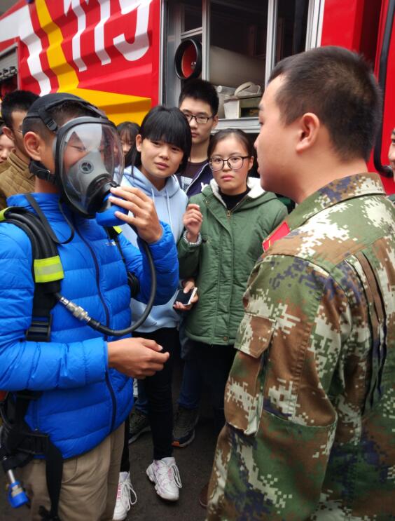 在消防队员们的带领下,同学们切身体验到了消防员们的艰苦与不易。有的同学体验了消防装备,尽管消防装备看起来很神气十足,但是整套准备却特别沉重,对体验者的体力是一个极大的考验,体验者均体会到了消防战士的辛苦。接下来,消防队员又领着同学们参观了很多消防设施和救援工具,并让同学们亲自操作体验,比如电锯、防毒面罩、抽水泵等。活动的最后,全体同学在消防队员带领下,来到了消防队党团活动室,观看了消防知识宣讲片,随后,消防队员又针对校园防火和灭火的相关知识进行详细的讲解,同学们受益匪浅。活动最后,同学们与消防队员们在消防车前合影,此次活动圆满落下帷幕,活动达到了预期效果。