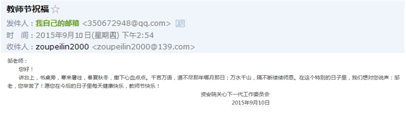 资安院关心下一代工作委员会的老师们近年以来一直关心着学院的发展和学生的成长。年过八十的关工委邹佩麟老师和我院很多名同学一直保持着长期的联系,经常通过电子邮件、书信等多种方式为同学们答疑解难,帮助学生解决生活、学习、心理等各个方面的困惑。邹老师还主动要求每学期到我院分党校,为我院入党积极分子同学开展专题教育培训会,和同学们分享他的革命故事,增强党性修养。关工委王文星老师作为学院教学督导员,经常深入教室,旁听我院青年教师的课堂,并根据自己多年的教学经验为青年教师们提出教学内容、方式等各方面的建议,促进我院青年教师的成长成熟。关工委彭续承老师、陈菊山老师等很多的退休老教师也非常关心学生,每年发展新党员入党的时候,他们都会主动要求与党员发展对象座谈,确保发展的每一位新党员都是思想成熟、立场坚定的合格的发展对象,极大的促进了我院学生党员发展工作的顺利进行。