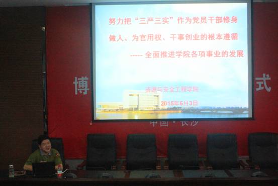 李顺求书记以“三严三实”的丰富内涵为基础,详细阐释了“严以修身、严以用权、严以律己、谋事要实、创业要实、做人要实”的重大实际意义,并结合学院的实际情况,要求党员干部努力把“三严三实”作为修身做人、为官用权、干事创业的根本遵循。李书记同时指出了现实生活中存在的“不严不实”的问题和具体表现。针对这些内容,李书记从三个方面就如何贯彻施行“三严三实”的要求做了详细的阐述。