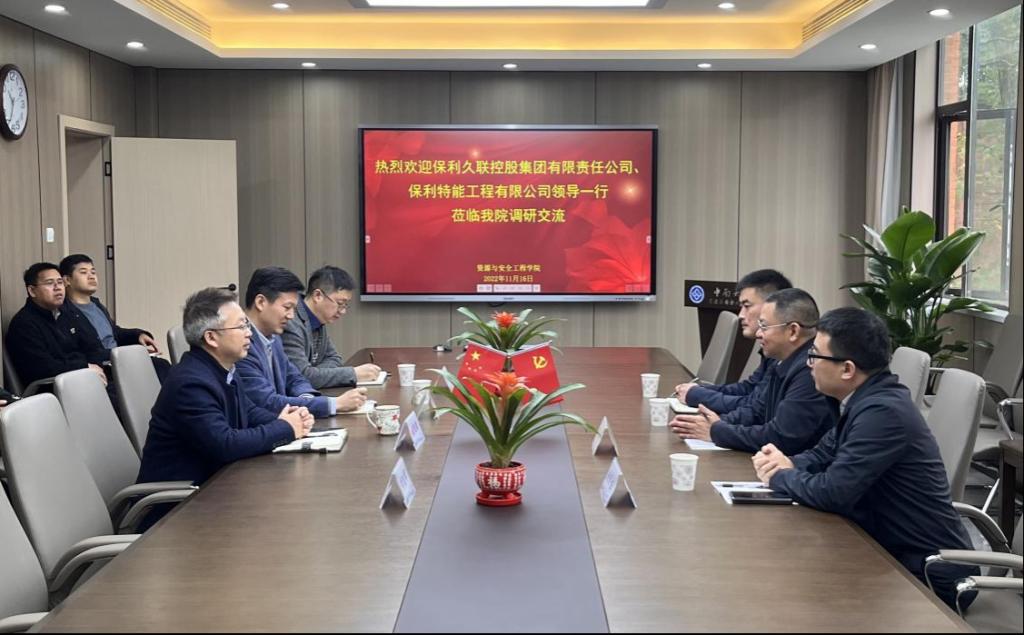 2022年11月16日上午9:30,保利久联控股集团有限公司、保利特能工程有限公司党委书记、董事长胡浩川及副总经理、总工程师赵明生一行来访taptap,点点在线平台,点点登录入口开展交流合作。交流会于采矿楼222会议室进行,由taptap,点点在线平台,点点登录入口党委书记欧旭理主持,我院院长周子龙、副院长李孜军、李地元等老师出席。