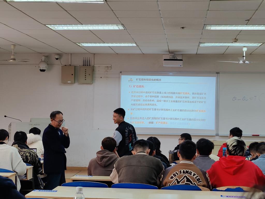 课堂上,黄仁东教授声情并茂、深入浅出,与学生积极互动,课堂氛围十分活跃。黄教授结合开采回采率、采矿贫化率和选矿回收率,从企业经济发展、国家资源开发、国际资源竞争等方面引导学生深入分析思考,他指出开采回采率和采矿贫化率不仅仅只是企业生产的经济指标,开采回采率更是保障国有资源有效开发利用的重要指标,具有重大战略意义,并要求学生在未来的研究、设计中严格按照《矿产资源法》等国家法律法规和标准执行,培养学生德技兼修、匠心报国。课后,黄锐副院长主持进行了课程思政与专业知识教学融合的分享交流。黄锐副院长指出,从课程思政的角度出发,在讲授的知识点中挖掘思政元素并融入课堂教学,积极探索符合学情的课程思政教学方式方法。在教学的过程中让学生了解国家资源开采的情况,培养学生的民族自信心和职业责任感。随后,黄仁东教授分享了课程思政教学心得,开采回采率应该上升到国家战略层面,对采矿贫化率的思考可以培养学生辩证思维能力,企业开采工程和行为要符合矿业法律法规,引导学生从系统角度思考问题,不只在术上求,更应该在道上修。