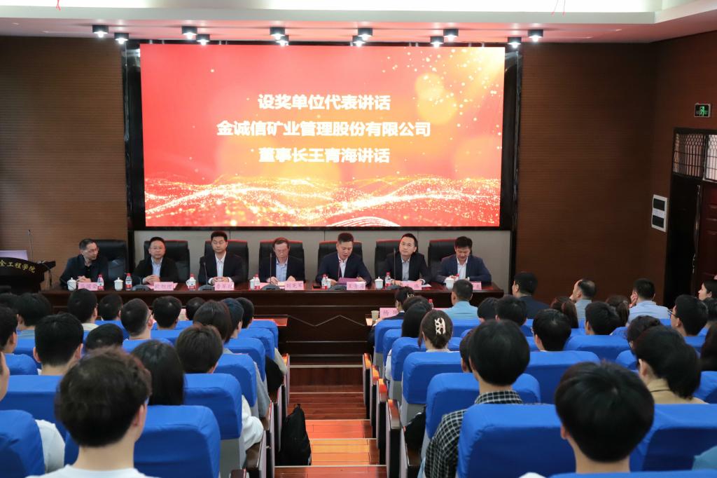 设奖单位领导依次发表讲话:金诚信矿业管理股份有限公司董事长王青海在讲话中指出金诚信的发展理念是以产业报国、实业兴国为己任,金诚信对人才培养的高度重视,对学院学子寄予殷切期望;宏大爆破工程集团有限责任公司常务副总经理鲁军纪在讲话中对宏大爆破涉及领域、取得成果、企业理念作出了详细解释,同时也对taptap教育科研、人才培养等方面给予了高度赞扬;深圳市中瑞恒管理策划有限公司轮值CEO王伟简要介绍了公司业务范围,为学院学子普及了行业知识,描绘了良好的就业前景。