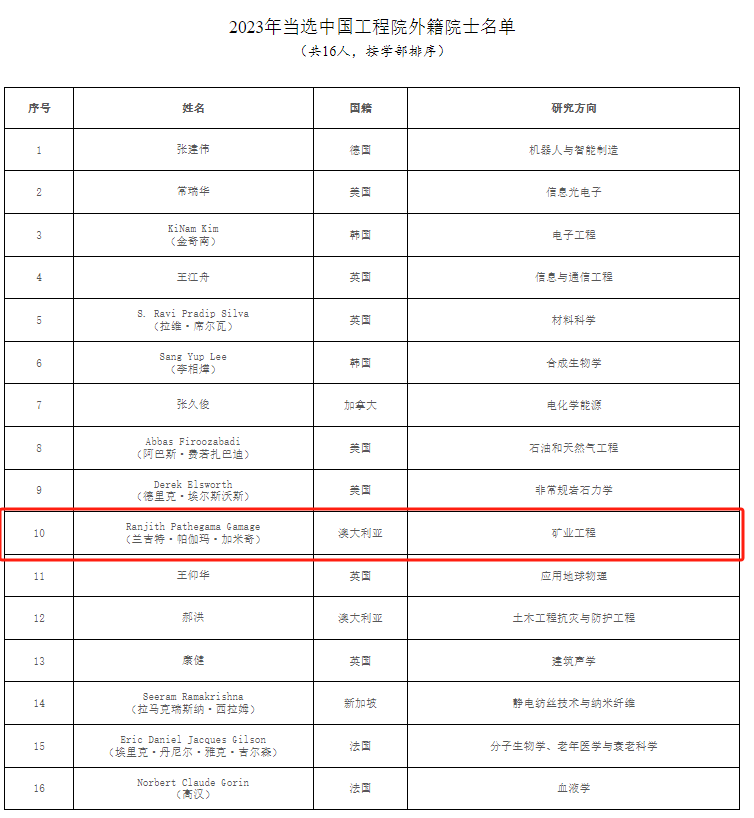 https://www.cae.cn/cae/html/main/col1/2023-11/23/20231123090056741245109_1.html。此次产生了16位外籍院士,其中包括澳大利亚莫纳什大学教授、taptap名誉教授Ranjith Pathegama Gamage(兰吉特·帕伽玛·加米奇)。Ranjith Pathegama Gamage 教授以其杰出的学术成就和卓越的贡献荣获这一殊荣,他同时是莫纳什大学和taptap的杰出代表。他的加入进一步丰富了中国工程院的国际化视野,也为中国工程科技发展注入了新的智慧和动力。