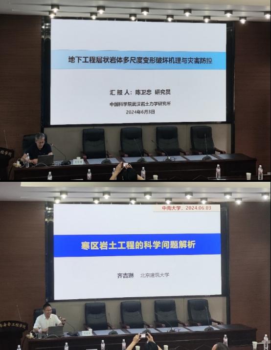 陈卫忠研究员,现为中国科学院武汉岩土力学研究所总工程师,中国科学院特聘研究员,国家杰出青年科学基金获得者和高层次人才计划入选者。本次受邀来学院进行学术交流,为学院师生做了题为《地下工程层状岩体多尺度变形破坏机理与灾害防控》的学术报告。报告对地下工程层状岩体多尺度变形破坏机理、岩体应力测量传感器的材料和精度、工程中岩体大变形支护体系等方面进行了介绍,并结合工程实例,让师生切实了解到实际施工过程中岩体环境的复杂性,从而提高对地下层状岩体相关工程的认识。