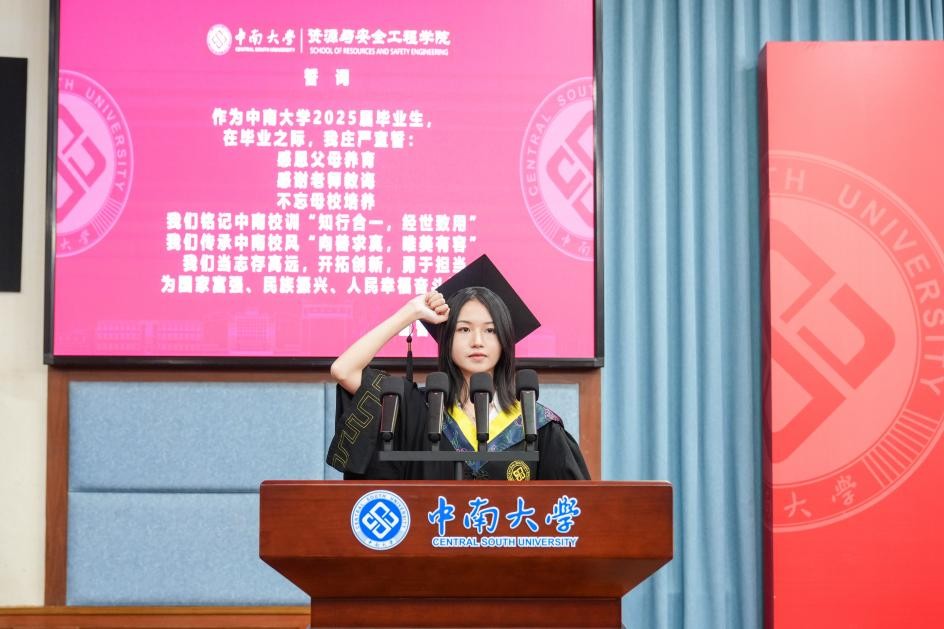 最后,全体毕业生在黄佳星同学的领誓下进行毕业宣誓。全体毕业生庄严肃立,字字铿锵,每一句誓言的回响都传递出了资安学子不懈奋斗的昂扬斗志和坚定信念,相信在不远的将来,2025届毕业生将会用脚步丈量大地,用实干捍卫誓言,用努力腾飞梦想!