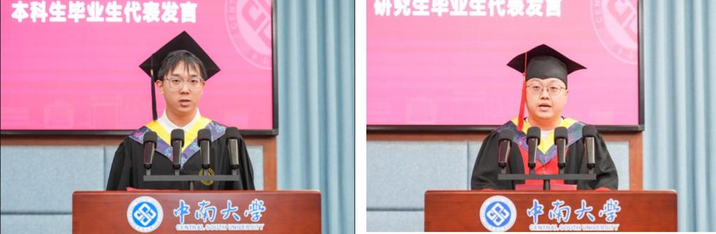 郑翱和王加闯同学分别作为本科和研究生毕业生代表讲话。“在学校平台的支撑下,在老师们的悉心教导下,每一次跨越,都让我们离那个更优秀、更自信的自己更近一步,也让我们懂得:真正的成长,是敢于把‘不可能’踩在脚下,把‘我想试试’变成‘我真的可以!’”,恳切的言辞中既表达出了对学校及老师托举培育的感恩之情,又体现出了对未来征程的坚定信心。